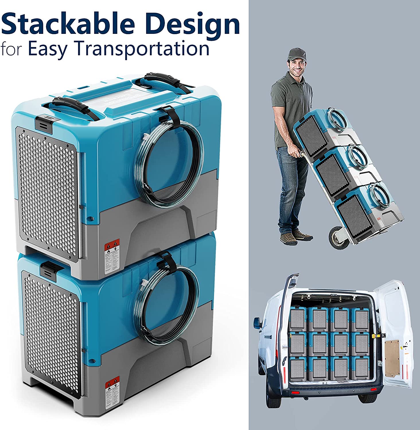 Ultra Portability, Stackable DesignThe compact design and rugged housing with indents cannot only save flood restorer more space but also make numbers of the machine been transported to the destination for after-flood restoration tasks. |