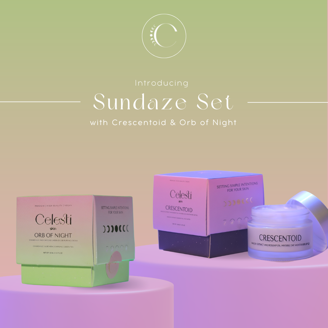 The Sundaze Set is the ideal bundle and protector for your skin barrier. Without much knowledge, we expose our skin to external stressors and disturb the moisture balance throughout the day. The invisible effect of Cresentoid is a perfect starter to your morning skincare routine and to create a shield around your barrier to fight the pollutants. Orb of Night works its wonder by creating a layer around your eyes to defend the sensitivity of the area.